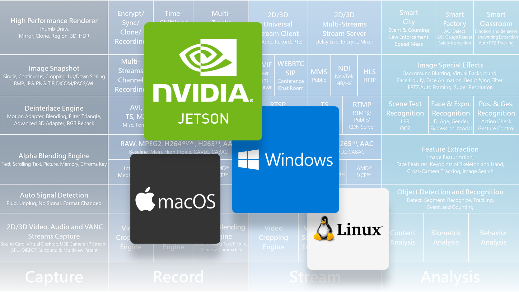 支援主流作業系統,包括 : Windows、Linux、macOS 和 NVIDIA Jetson 平台。開發者可以輕鬆地在各種裝置和應用程式中整合視訊擷取、串流媒體和 AI 處理功能。