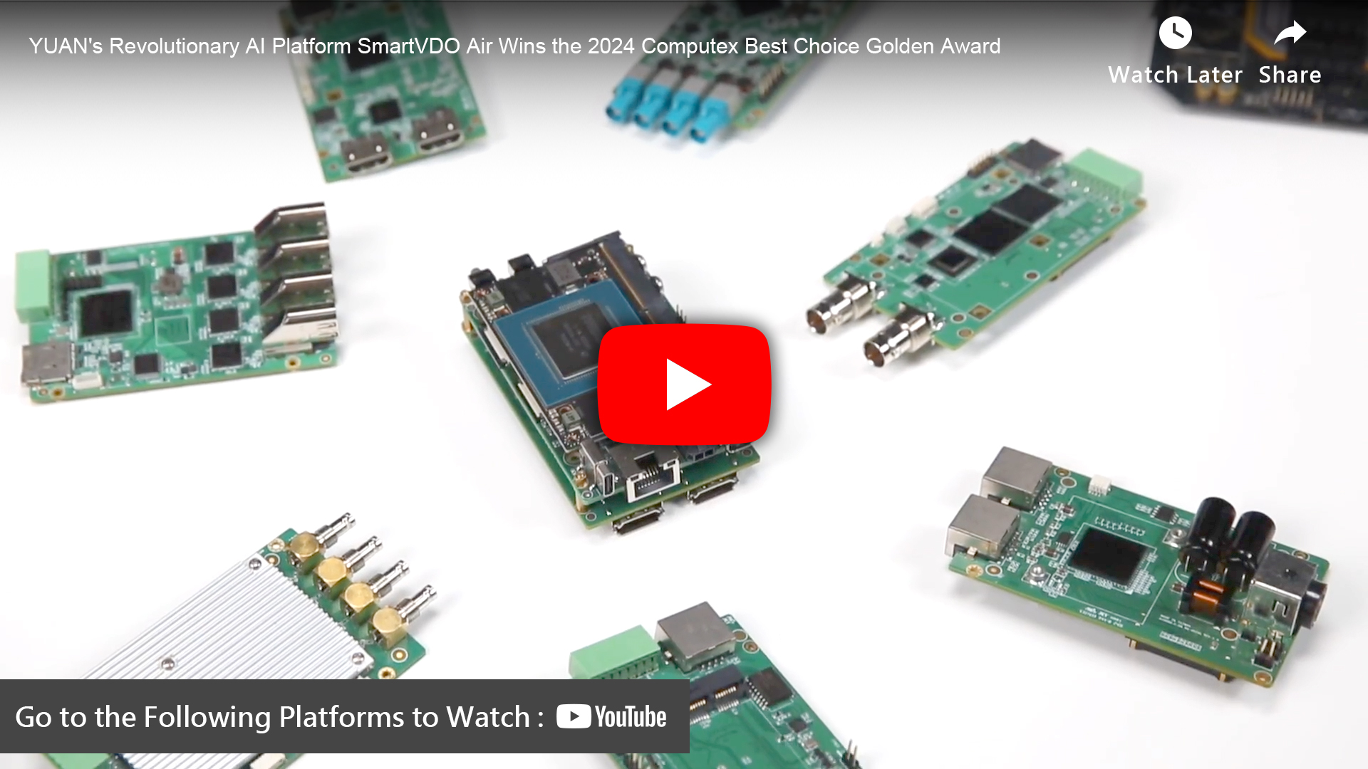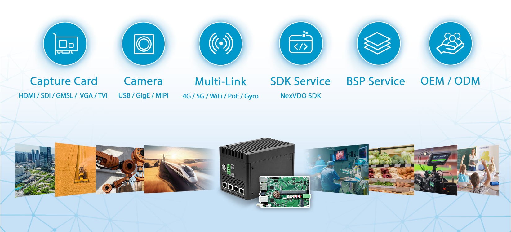 影像處理平台可任意搭配 YUAN 的影像採集卡,其支援包括 : SDI、HDMI、GMSL、VGA、YPbPr、AVS 和 Ethernet 等各式接口,實現彈性化的輸入配置。